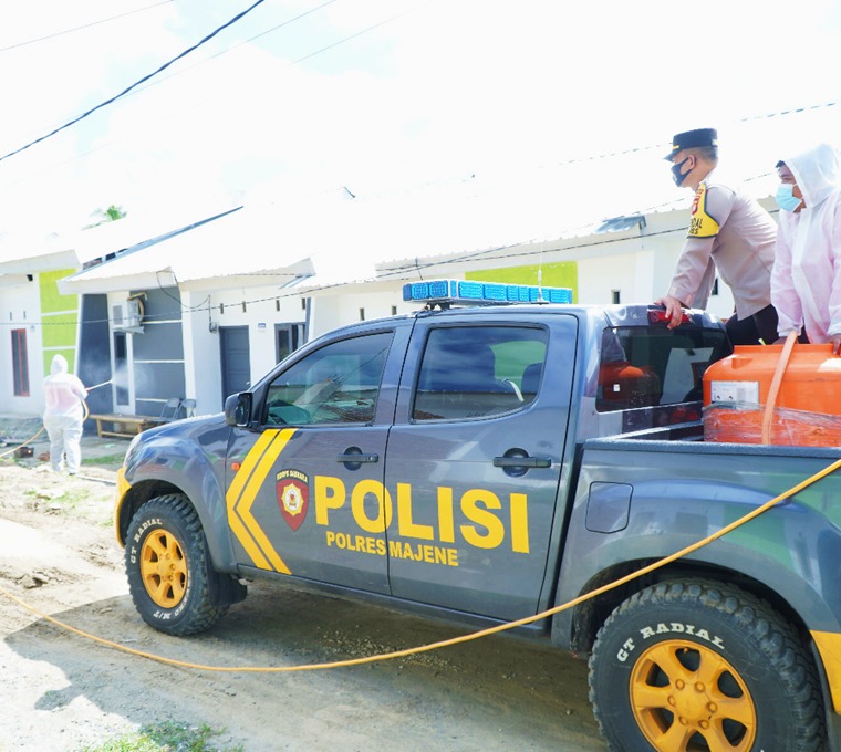 Kabag Ops AKP Ujang Saputra yang memimpin kegiatan tersebut menuturkan, “ ada sebanyak 4 titik yang kami lakukan penyemprotan cairan disinfectan hari ini diantaranya pemukiman warga di BTN Tanampali Lembang, Pasar Sentral Majene, Asrama Kompi A 721 Mks dan Asrama Polres Majene.