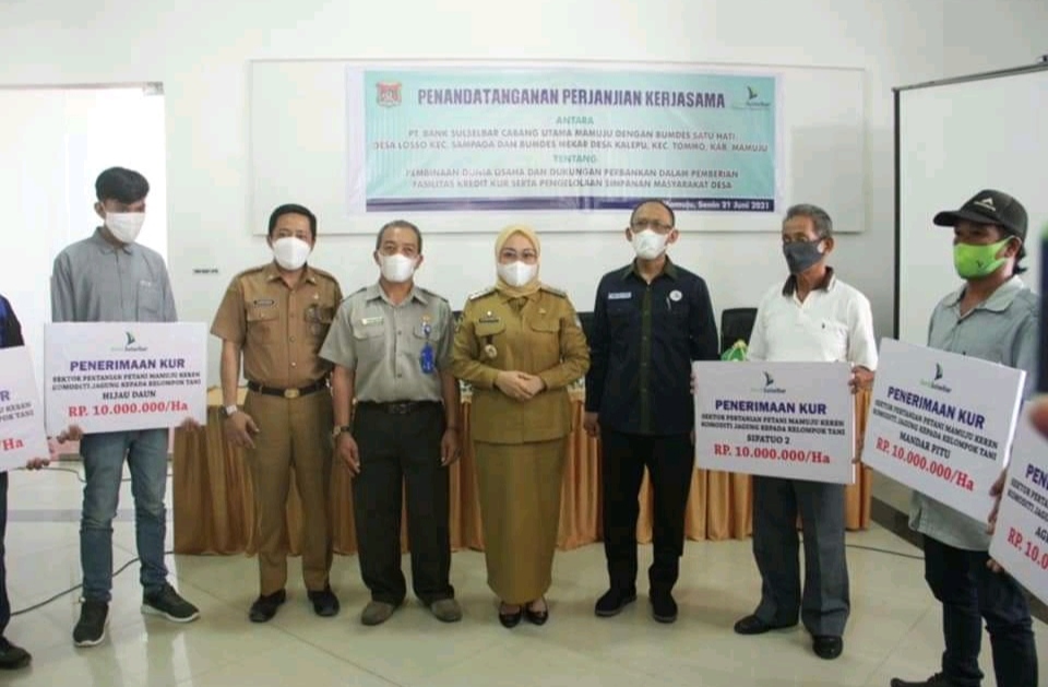 Penandatanganan MOU sekaligus penyerahan dana KUR yang diperuntukkan terhadap petani dengan luas areal 10.000 Ha, diserahkan kepada fasilitator pembiayaan petani swadaya sulawesi barat yang terdiri dari PT. Amory multi quality dan PT. Karya agung prawita, serta PT. Jasindo, disaksikan oleh Bupati Mamuju Hj. Sitti Sutinah Suhardi di kantor bupati sementara Sapota (Senin, 21 Juni 2021)