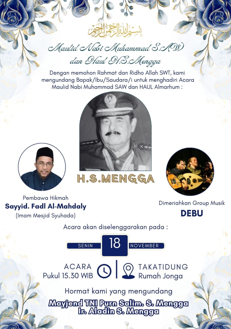 “Jadikan langkahmu bagian dari keberkahan,” seru keluarga besar Almarhum H.S. Mengga, Mayjen TNI Purn. Salim S. Mengga dan Ir. Aladin S. Mengga, yang turut mengundang seluruh lapisan masyarakat untuk hadir.