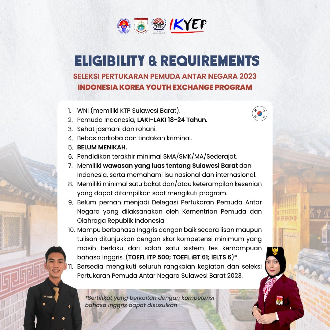 Ketua PCMI Sulawesi Barat Periode 2022-2025 Andi Tenri Wulang menyampaikan, bahwa Tahun 2023, kouta untuk Provinsi Sulawesi Barat adalah perempuan usia 22-30 tahun untuk program Singapore Indonesian Youth Leaders Exchanges Program (SIYLEP) dan laki-laki usia 18-24 tahun untuk program Indonesia Korea Youth Exchanges Program (IKYEP).