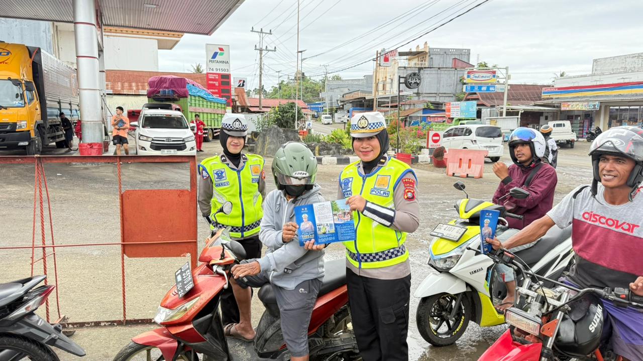 Selain memberikan leaflet, personel juga menyampaikan edukasi secara tatap muka kepada masyarakat pengguna jalan.
