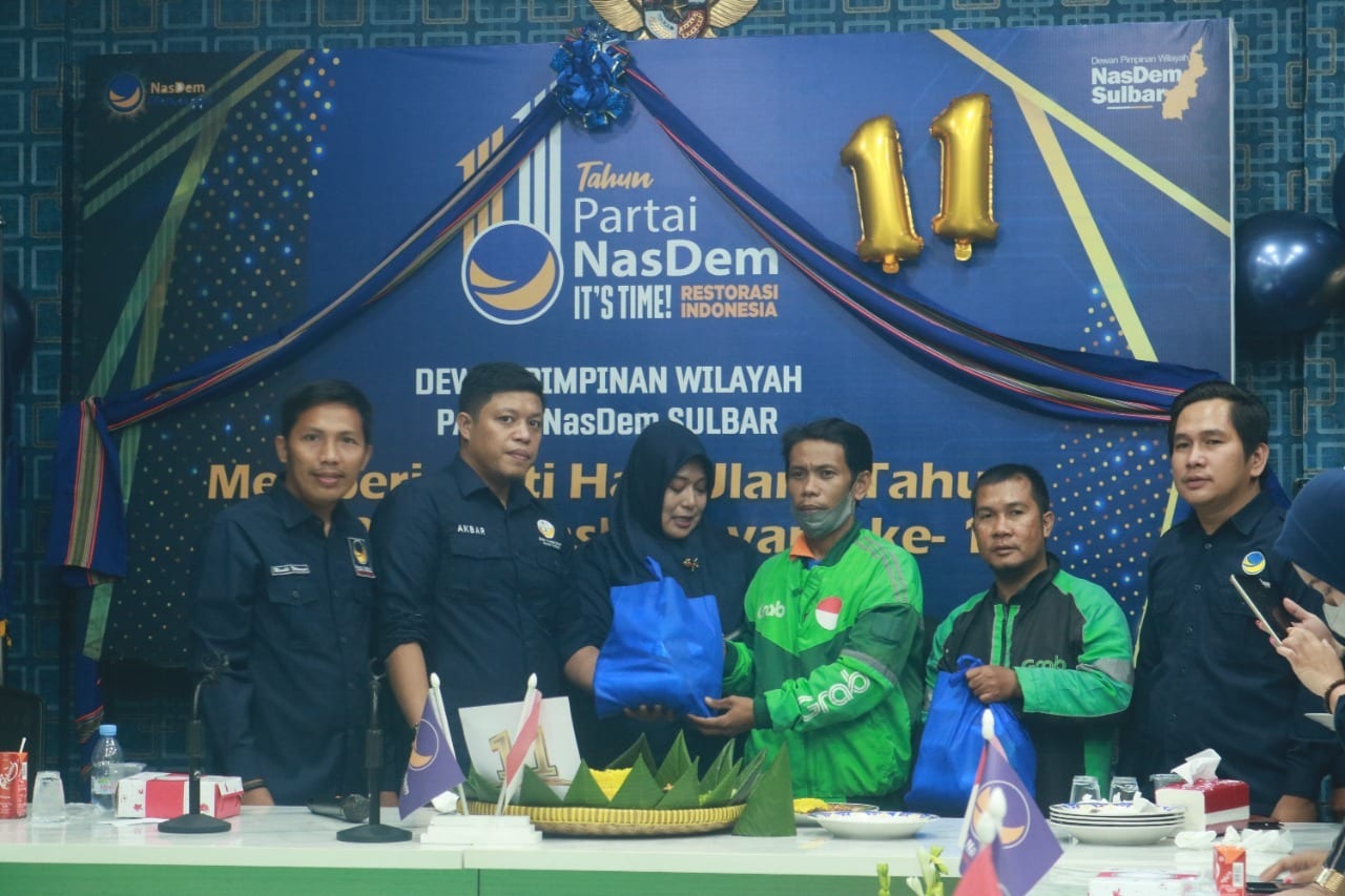 Diketahui perayaan HUT Partai NasDem Sulbar yang ke-11 tahun dihadiri oleh Wakil Sekretaris Bidang Kebijakan Publik dan Isu Strategis Santa, Wakil ketua bidang kesehatan