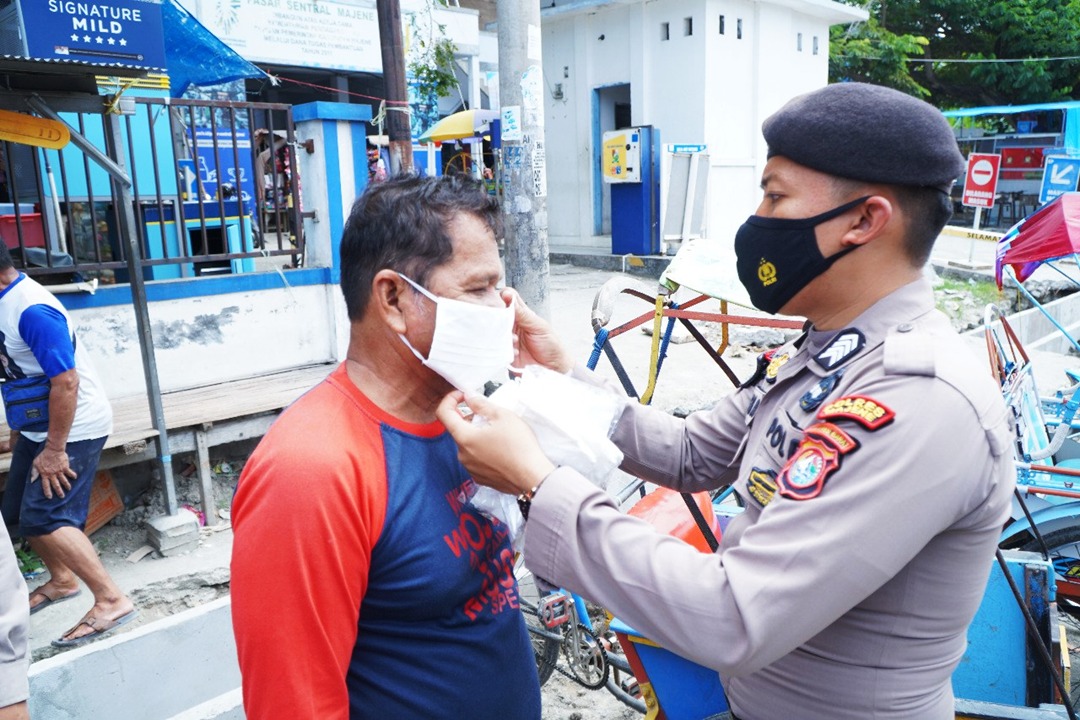 Majene, iS – Masih banyaknya masyarakat yang beraktivitas di tempat-tempat keramaian dalam kota majene dapat membuka celah penularan Covid-19, Polres Majene kembali lakukan upaya antisipasi dengan membagikan Puluhan masker gratis kepada warga dan para pengunjung pasar di pasar sentral Majene. (28/7/2021)