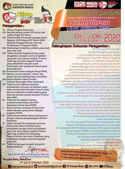Mamuju, Inisulbar.com — KPU Kabupaten Mamuju membuka seleksi calon Anggota Kelompok Penyelenggara Pemungutan Suara (KPPS) untuk Pilkada tahun 2020. Masa penerimaan berkas