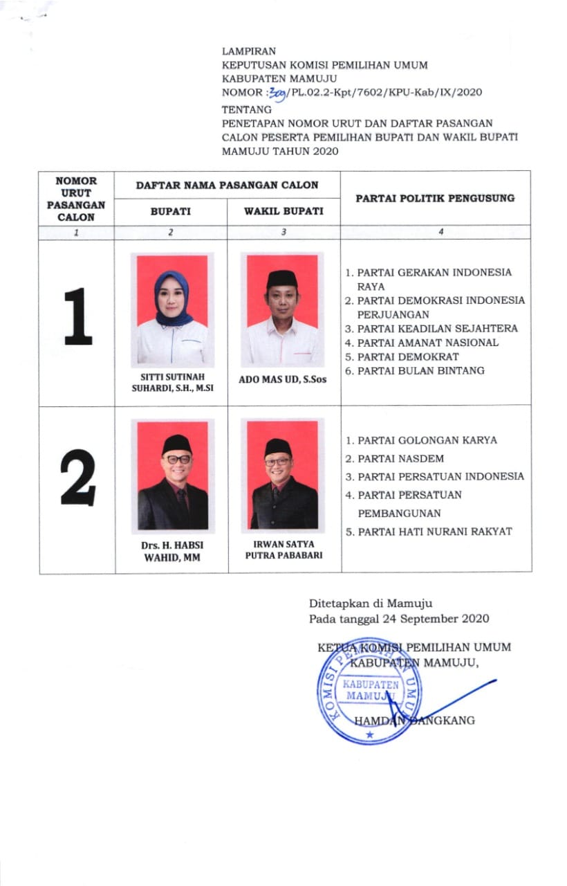 Mamuju, Inisulbar.com — Komisi Pemilihan Umum (KPU) Kabupaten Mamuju, secara resmi mengumumkan dua pasangan calon Bupati dan Wakil Bupati, untuk Pilkada 09