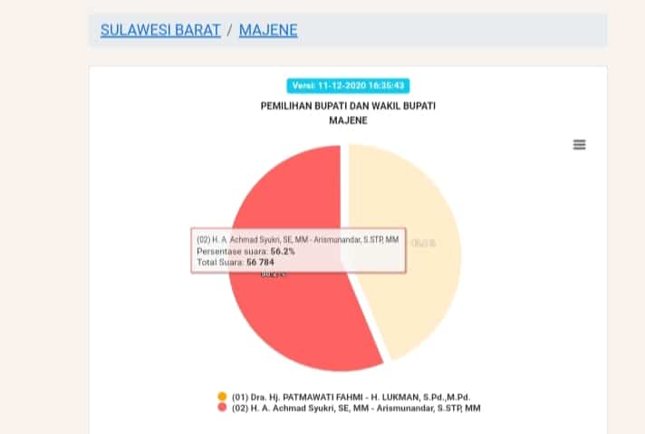 “Saat ini, hasil Pilkada Majene 2020 sudah diketahui hasilnya baik real count, quick count dan termasuk sajian Perhitungan real count melalui portal KPU. Hasilnya menunjukkan bahwa No. 2, Ast-Aris unggul atas Calon petahana Patmawati-Lukman, yang hanya finish dengan torehan 44.176 atau 43,8 persen, dari 420 Tempat Pemungutan Suara (TPS),” ujarnya.