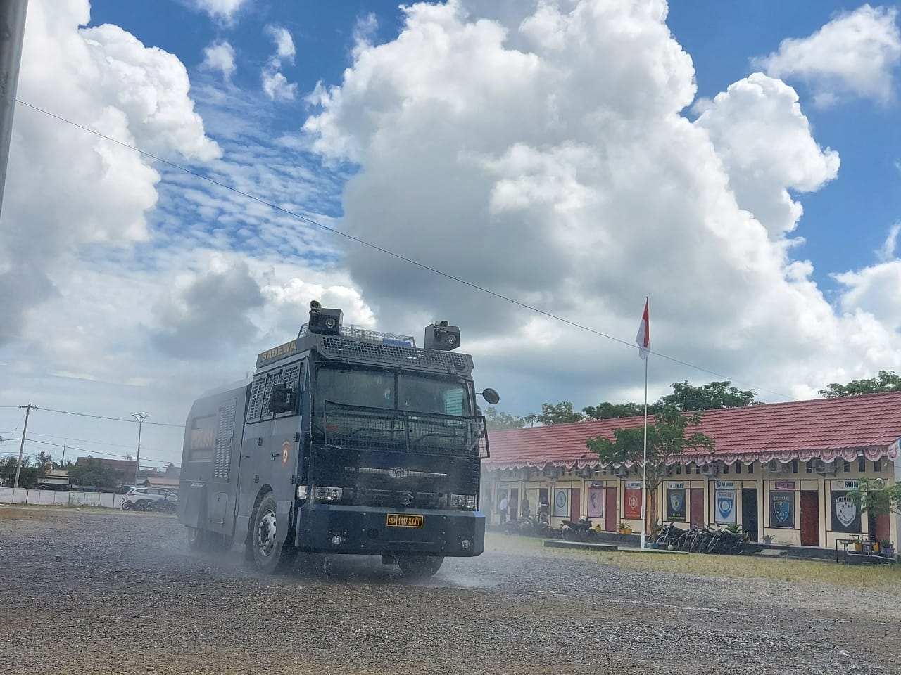Sterilisasi Mako, Polres Mateng Semprotkan Disinfektan Gunakan Kendaraan Water Canon
