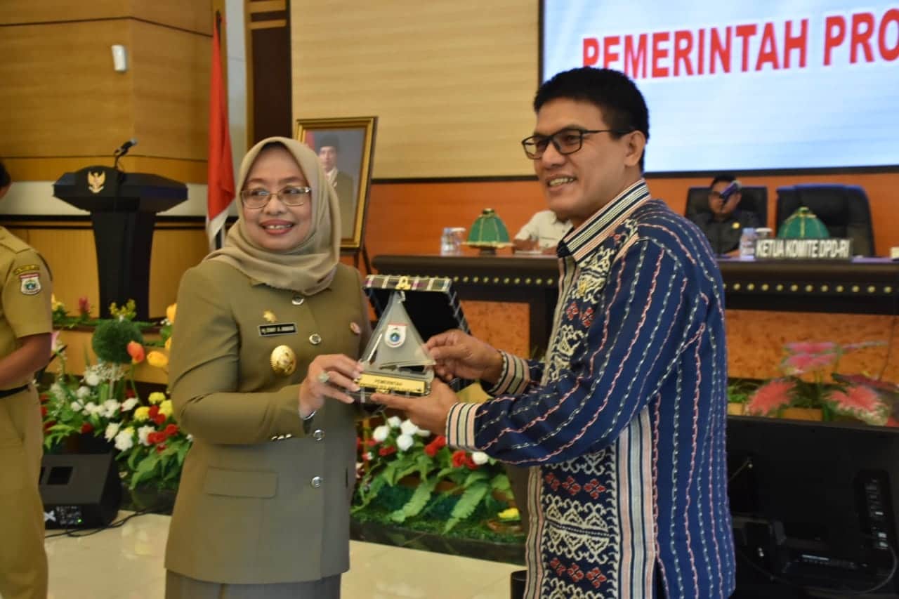 Mamuju, iS – Wakil Gubernur Sulbar, Enny Anggraeni Anwar, menyerahkan dokumen usulan pembentukan Kota Mamuju dan Kabupaten Balanipa kepada Wakil Ketua II,