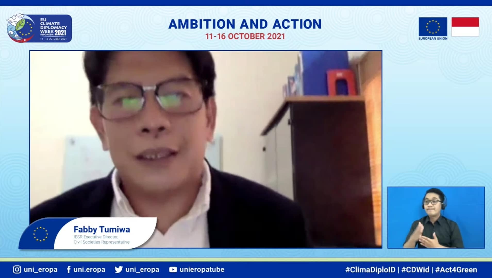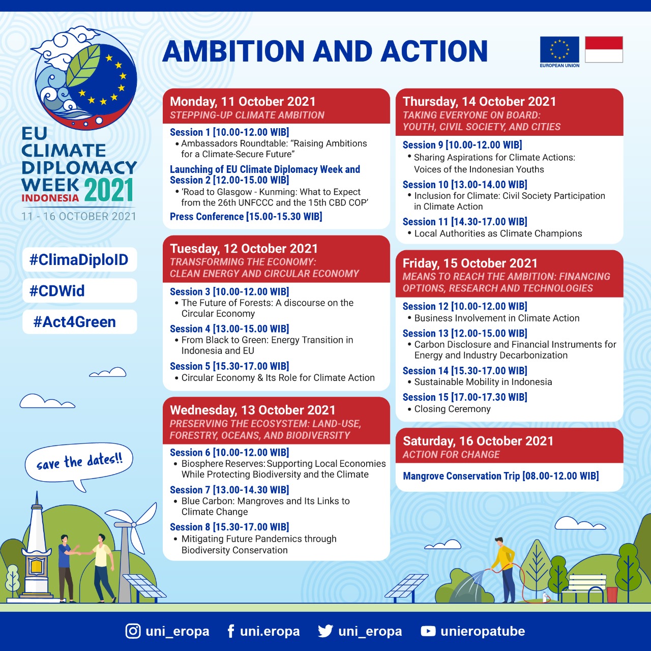 Pekan Diplomasi Iklim 2021 kali ini menghadirkan 40 pembicara dalam 15 sesi seperti webinar, sesi bincang, dialog; dan sejumlah kegiatan lainnya termasuk aksi tanam pohon bakau. Pada kesempatan tersebut, hadir memberikan sambutan, Vincent Piket (Duta Besar Uni Eropa untuk Indonesia), Lars Bo Larsen (Duta Besar Denmark untuk Indonesia), Ina Lepel (Duta Besar designate Jerman untuk Indonesia), Beata Stoczyńska (Duta Besar Polandia untuk Indonesia), Henritte Faergemann (Konselor Pertama urusan Lingkungan, Aksi Iklim, Digital dari Delegasi Uni Eropa untuk Indonesia). Juga pernyataan dari dua perwakilan pemuda Dunia yaitu, Joshua Steib; wakil kelompok pemuda pada United Nations Youth Summit dan Pre COP 26 di Milan, Italia dan Fabby Tumiwa; IESR Executive Director & Civil Societies Representative.