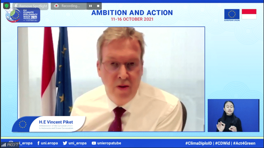 “Uni Eropa telah melakukan bagiannya dengan mengadopsi Kesepakatan Hijau Eropa (European Green Deal), yaitu peta jalan menuju netralitas iklim Uni Eropa pada tahun 2050. Kami juga mengadopsi paket ‘Fit for 55’ yaitu proposal legislatif dan kebijakan untuk memenuhi target pengurangan emisi setidaknya 55% pada 2030, dibanding tingkat ditahun 1990,” tegas Duta Besar Uni Eropa Piket.