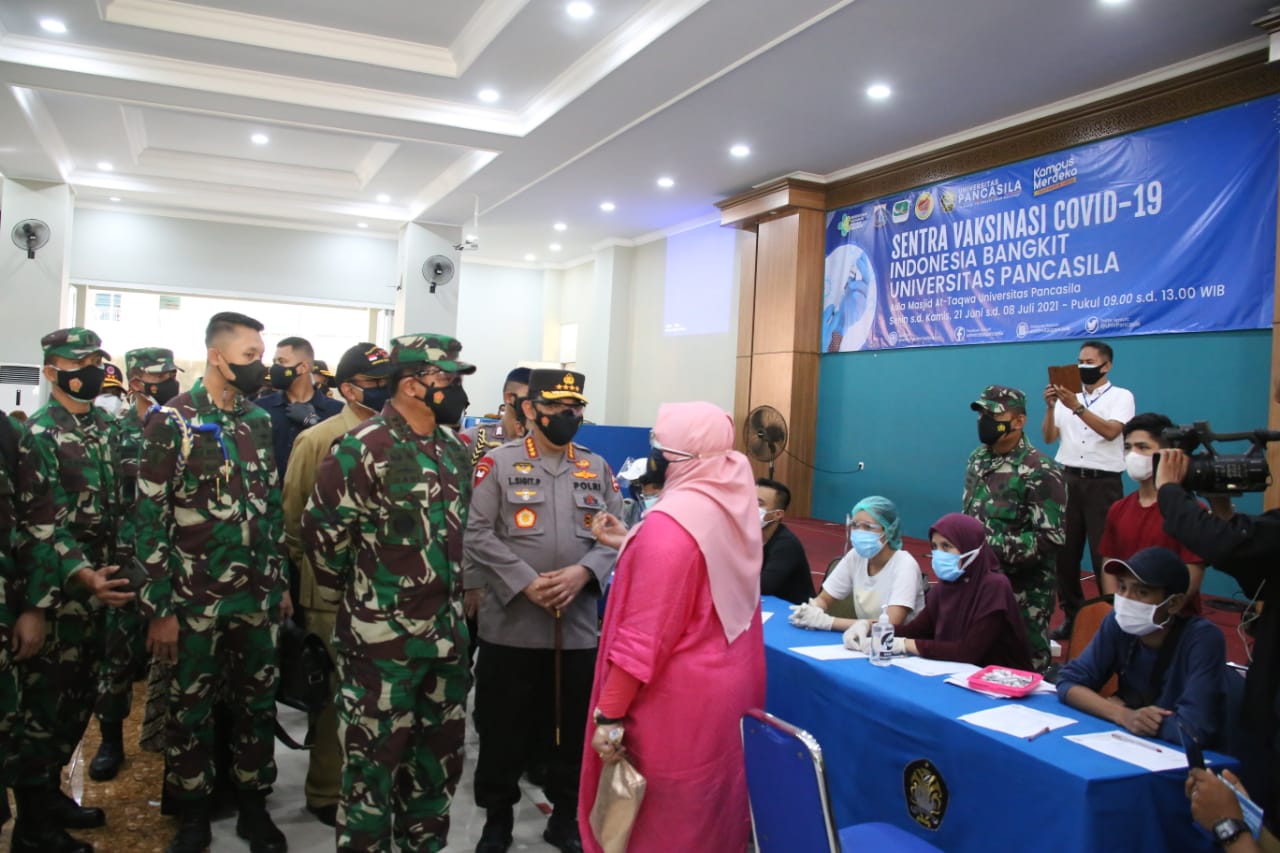 Jakarta, iS — Panglima TNI Marsekal Hadi Tjahjanto bersama Kapolri Jenderal Listyo Sigit Prabowo meninjau langsung proses vaksinasi di Universitas Pancasila, Jagakarsa, Jakarta Selatan, Senin (5/7/2021).