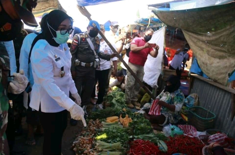 Mamuju, Inisulbar.com — Bupati Mamuju, Siti Sutinah Suhardi memimpin langsung forum koordinasi pimpinan daerah (forkopimda) Mamuju yang terdiri dari Dandim 1418 Kolonel Inf Tri Aji Sartono, Kejari Mamuju Subekhan, SH.,MH, dan Polresta Mamuju di wakili kabag OPS Kompol Muh. Imbar Bakri, melakukan inspeksi mendadak ke sejumlah pusat perekonomian masyarakat seperti pasar tradisional dan retail modern guna memantau perkembangan harga dan stok barang jelang Idul Fitri 1942 H. Rabu (5/5/2021).