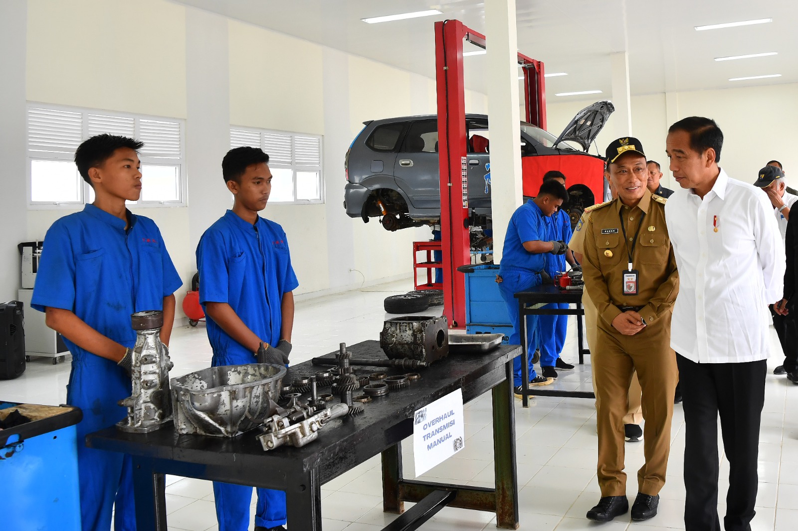 Setibanya di SMKN 1 Rangas, Presiden Jokowi langsung menuju laboratorium praktik teknik otomotif. Presiden menyimak penjelasan sekaligus melihat sejumlah siswa sedang melakukan perbaikan mobil transmisi manual dan memasang ban mobil.