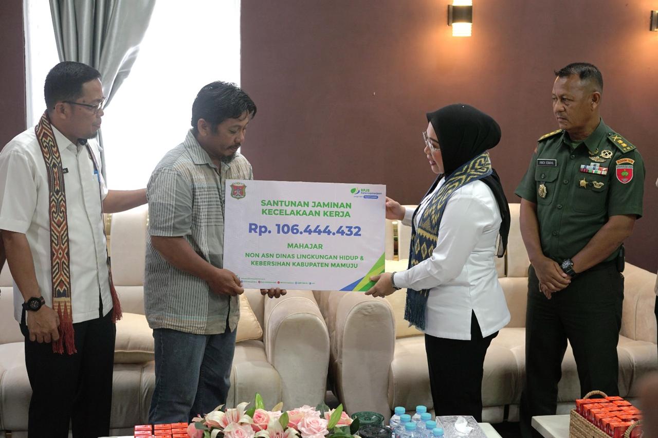 Mamuju, Inisulbar.com, – Ahli waris Almarhum Muhajar, Salah seorang tenaga kebersihan pada DLHK Mamuju, yang meninggal dunia usai mengalami kecelakaan, hari ini menerima santunan dari BPJS Ketenaga Kerjaan yang diserahkan oleh Bupati Mamuju Dr.Hj.Sitti Sutinah Suhardi,bersama Kepala BPJS Ketenaga Kerjaan Provinsi Sulawesi Barat, Makmur, Rabu (11/9/2024).