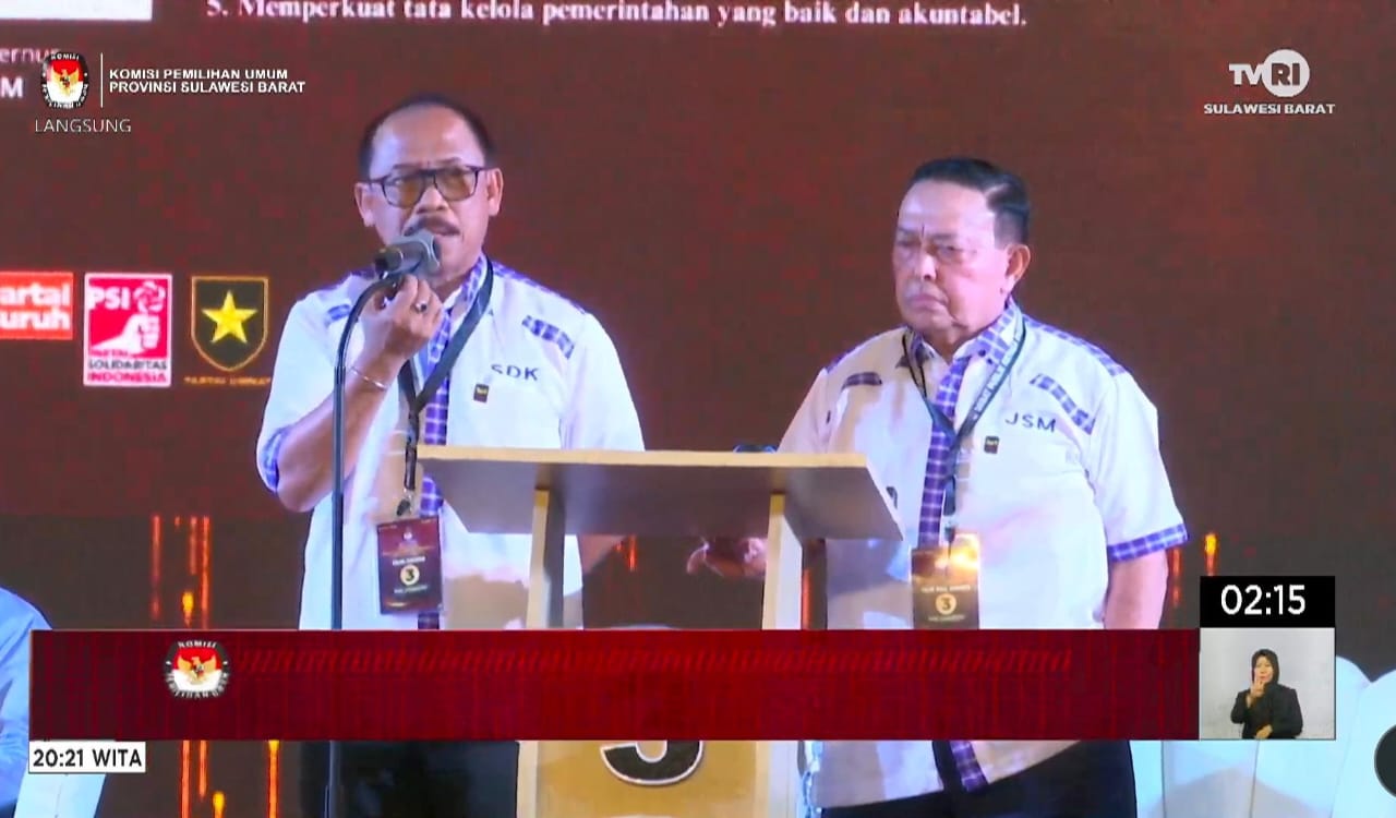 Majene, Inisulbar.com, – Pasangan calon Gubernur dan Wakil Gubernur Sulawesi Barat nomor urut 3, Suhardi Duka dan Jenderal Salim Mengga (SDK-JSM), memberikan penampilan memukau saat menyampaikan visi dan misi tanpa menggunakan teks pada debat ketiga Pemilihan Gubernur (Pilgub) Sulbar yang digelar, di Majene, Rabu (20/11/2024).