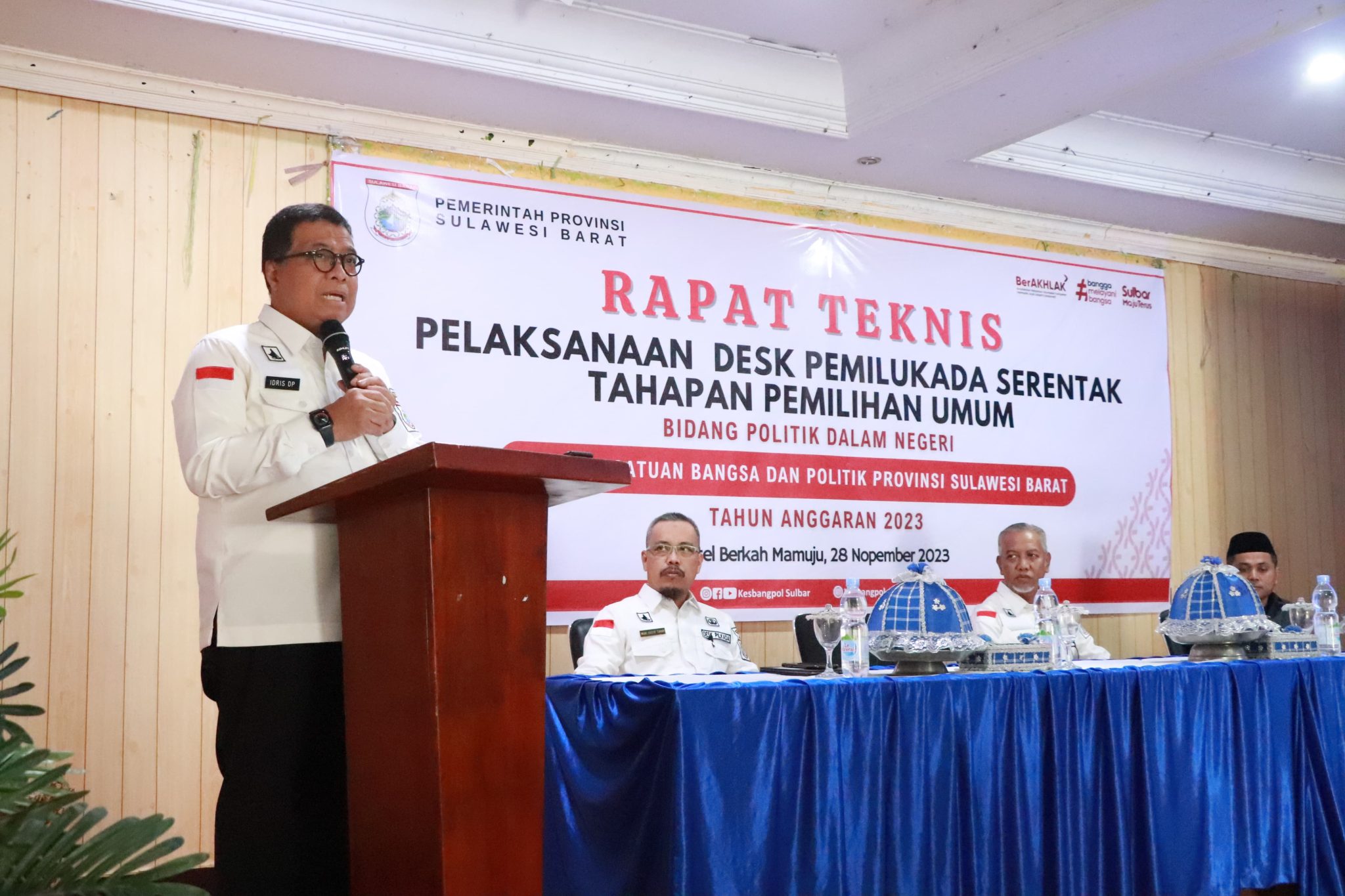 Mamuju, iS – Pemprov Sulbar melalui Badan Kesatuan Bangsa dan Politik (Kesbangpol) Sulbar melaksanakan rapat teknis pelaksanaan desk Pemilukada serentak dan tahapan Pemilihan umum di Hotel Berkah, Selasa (28/11/2023).